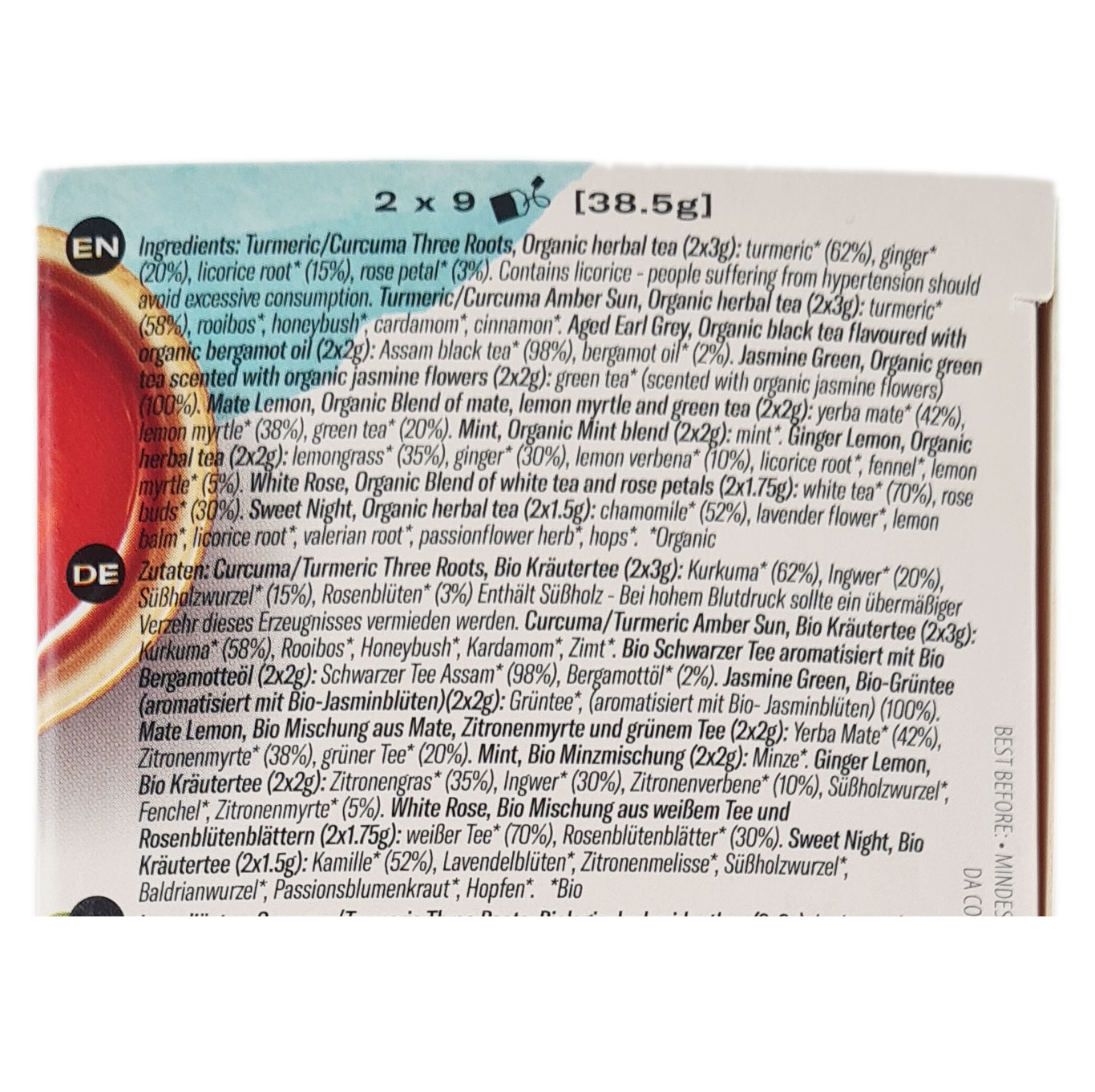 Vsebina škatlice: izbor 18 čajnih vrečk, po dve od vsakega okusa: Aged Earl Grey, Ginger Lemon, Jasmine Green, Mate Lemon, Mint, Sweet Night, Turmeric Amber Sun, Turmeric Three Roots & White Rose.