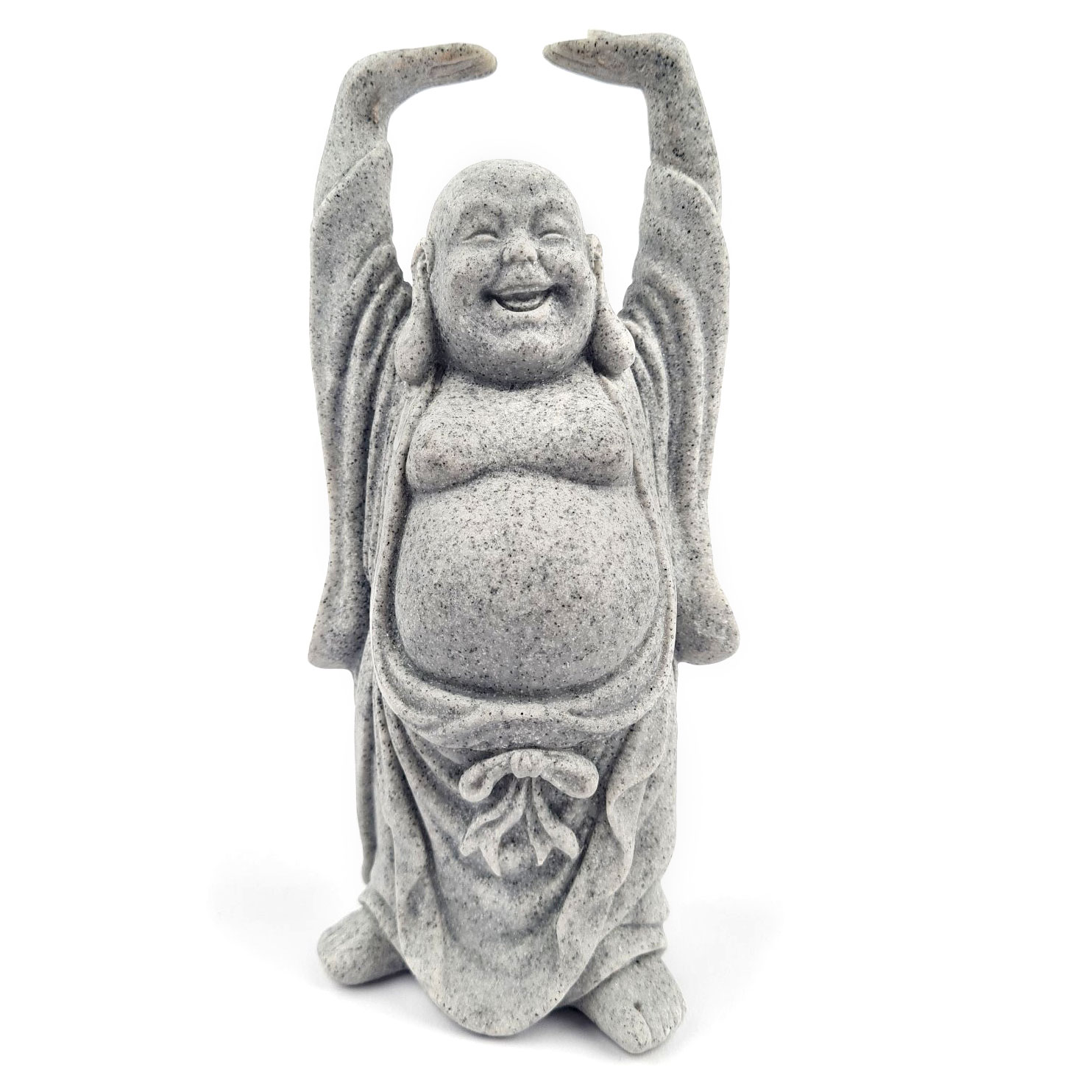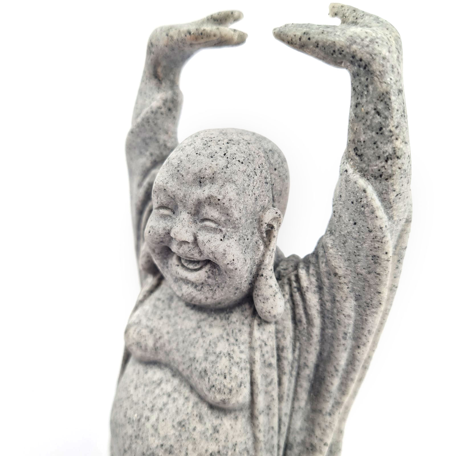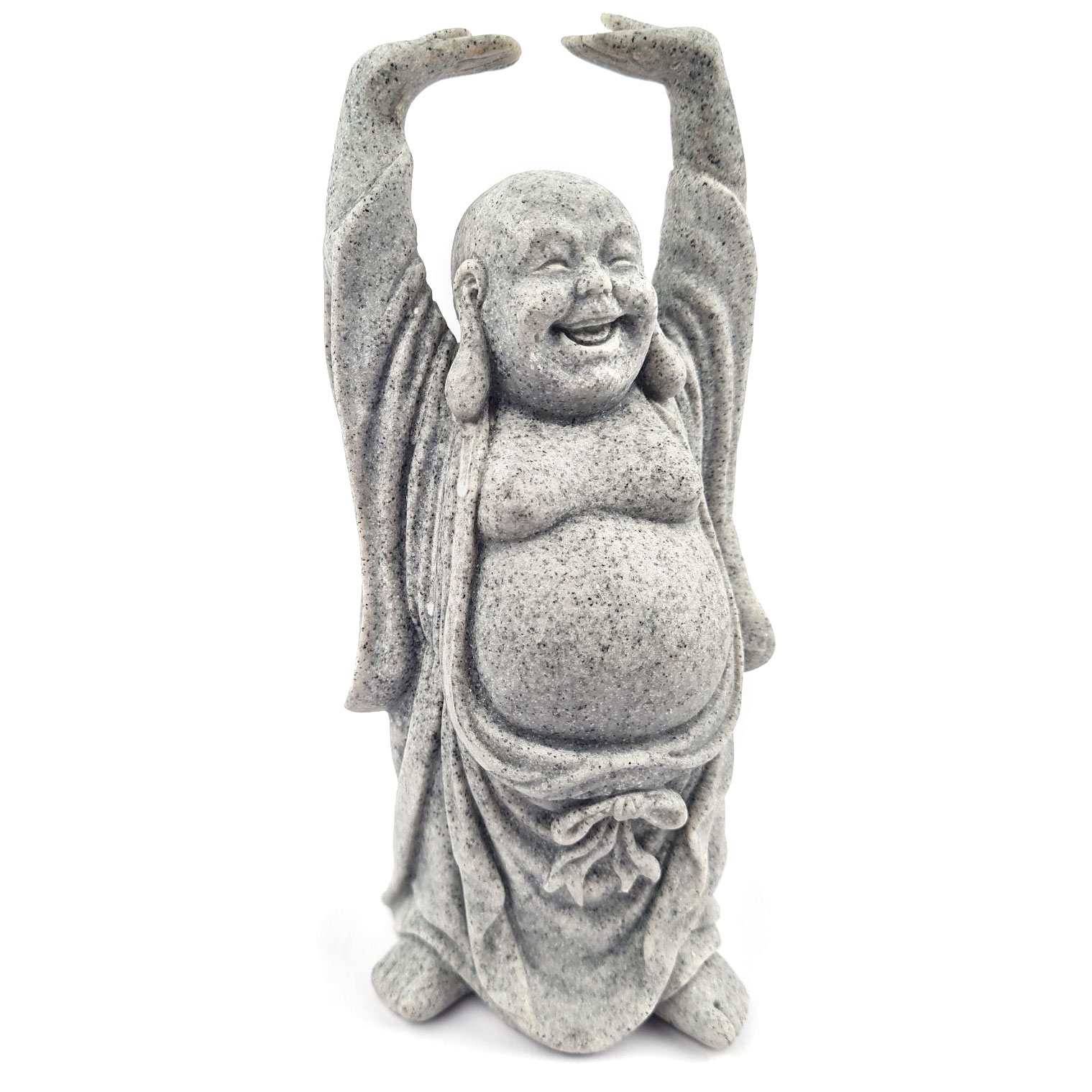 Smejoči se Buda z dvignjenimi rokami v prostor prinaša nalezljivo veselje in energijo obilja. Kipec z višino 17 cm s svojo držo simbolizira premagovanje skrbi ter vabilo k sreči in blaginji v vsakdanjem življenju. Siva tekstura s kamnitim videzom se poda v vsak kotiček doma, kjer potrebujete opomnik na lahkotnost bivanja in notranje zadovoljstvo.