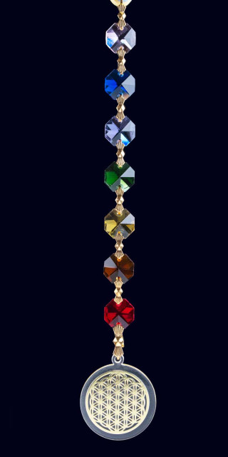Sedem majhnih osmerokotnih kristalov, ki simbolizirajo sedem barv čaker in rožo življenja iz epoksi smole.