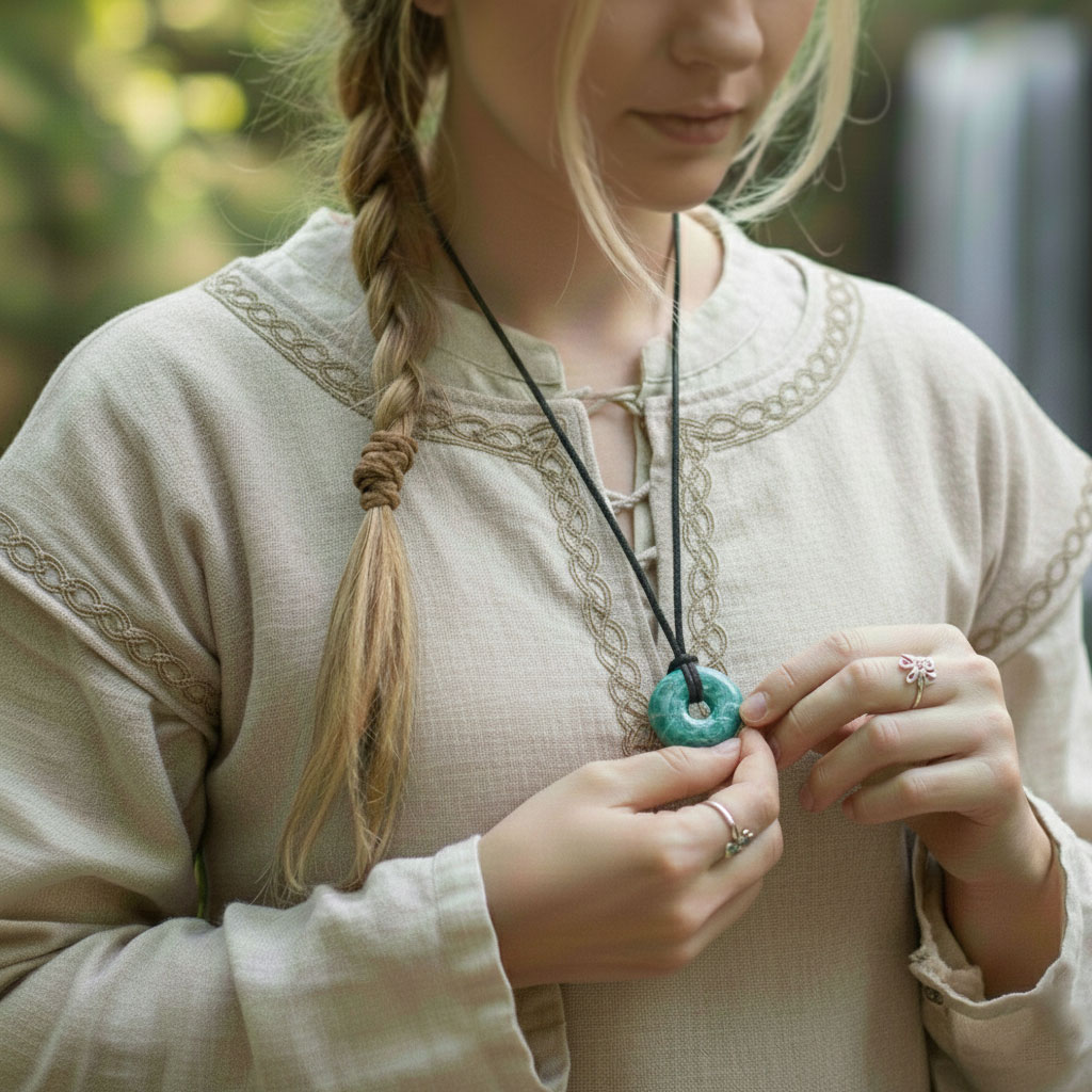 Poliran amazonit v obliki donuta je nameščen na temno črni bombažni vrvici, katere dolžino lahko prilagodite z drsnimi vozli. Naravni bombaž je prijeten ob stiku s kožo in dopolnjuje nežno modrozeleno barvo kamna.