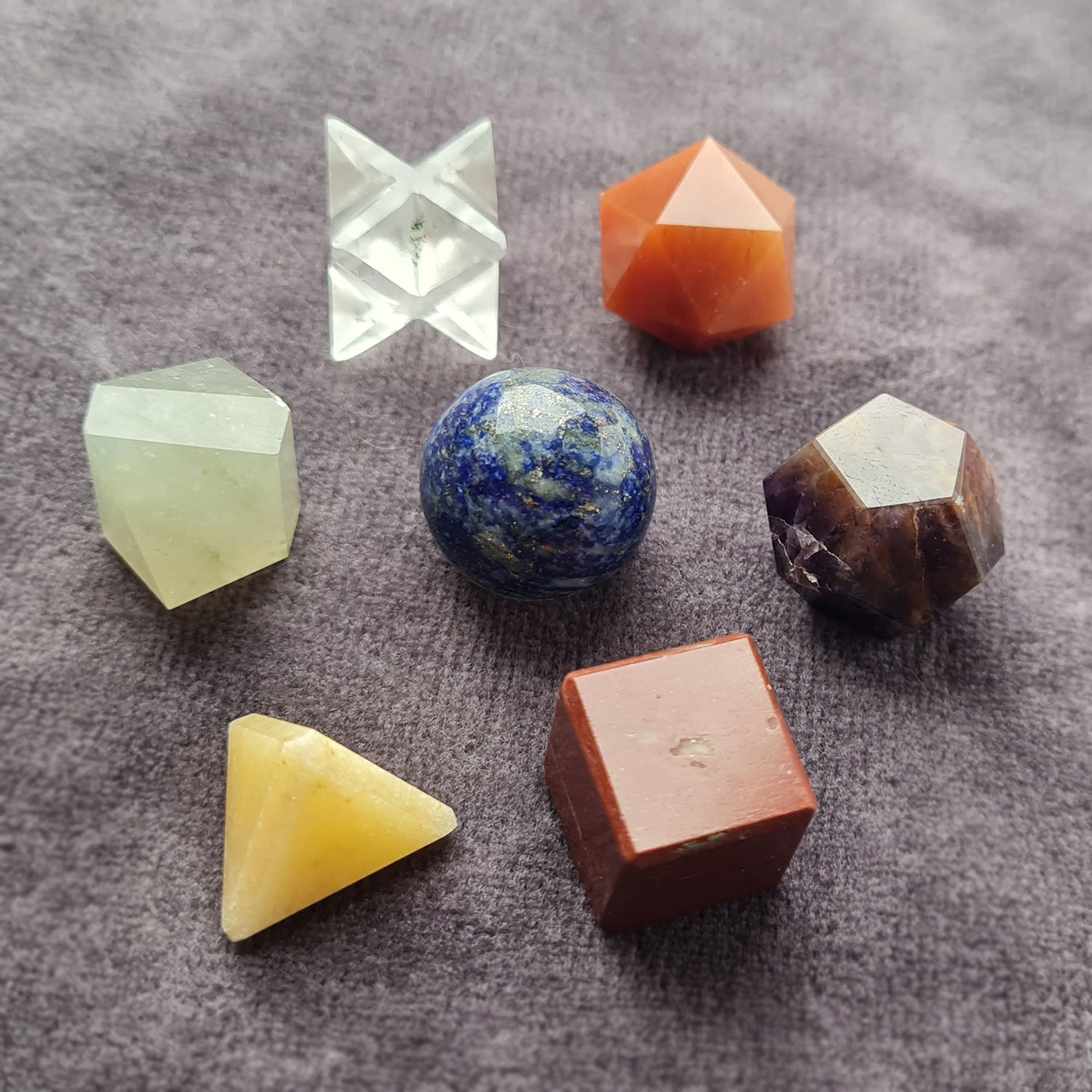 The Sacred Geometry set combines the power of gemstones with universal geometric shapes that represent the fundamental building blocks of the universe. The set consists of seven hand-shaped figures: the five Platonic solids, a star tetrahedron (Merkaba), and a sphere. Each piece is crafted from a gemstone that corresponds in color and energy to a specific chakra, allowing for profound energy work, chakra balancing, and the removal of blockages.